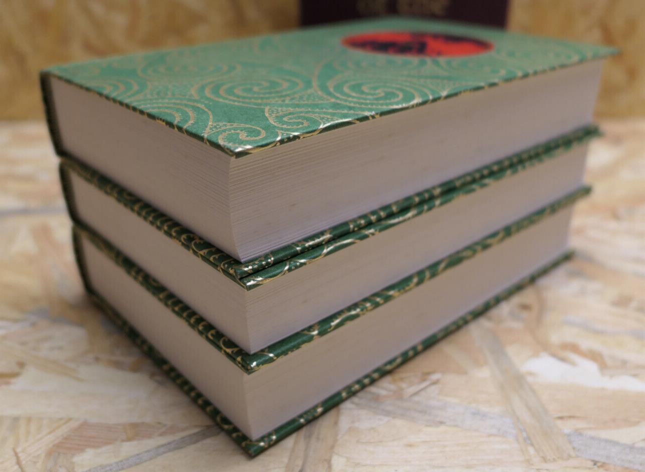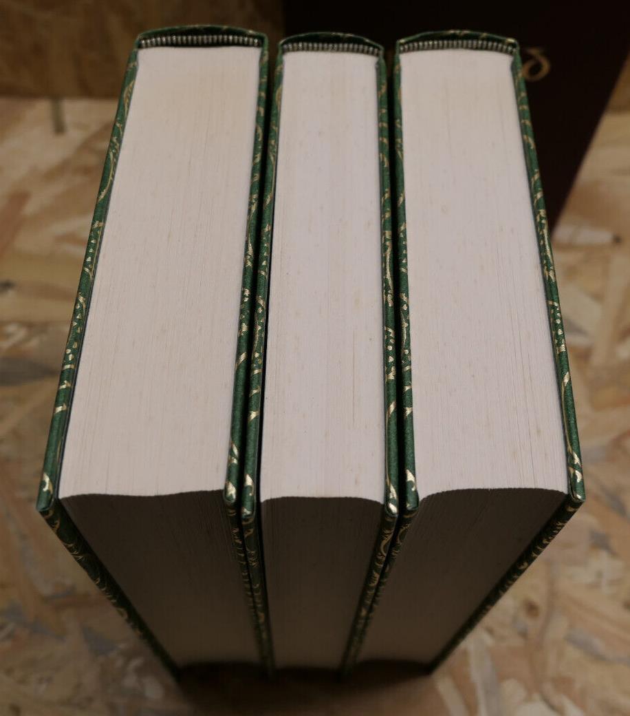 des trois volumes en très bon état, à noter de petites et légères rousseurs éparses sur les tranches, couvertures en très bon état. Emboitage cartonné en bon état présentant de légères marques d'usage, des frottements et quelques petites tâches, voir et agrandir les