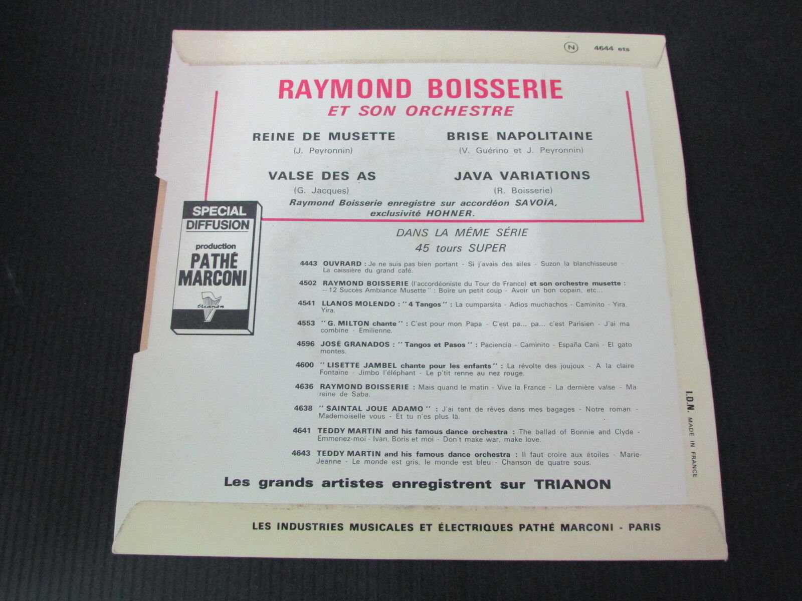 Face 1 : Reine de musette - Valse des as Face 2 : Brise napolitaine - Java variations TRIANON 4644 - FRANCE Vinyl : VG++Pochette / Sleeve : VG++ LIVRAISON RAPIDE ET SOIGNEEWORLDWIDE SHIPPING - FOREIGN BUYERS, ASK ME FOR SHIPPING COST